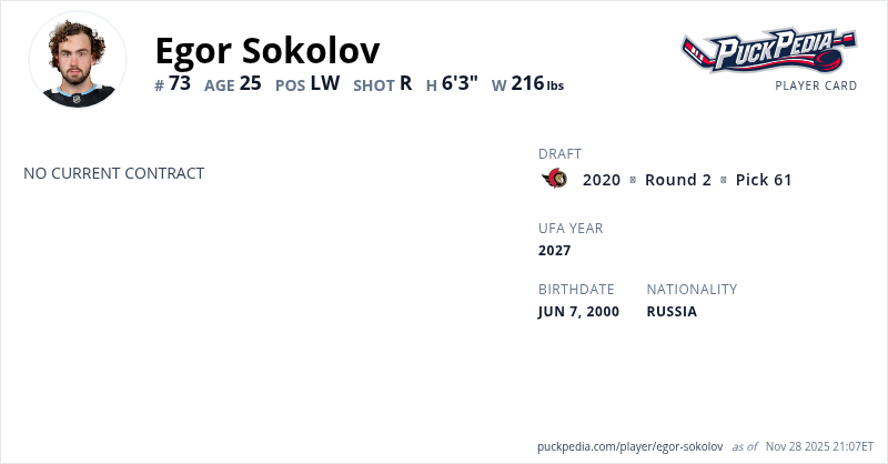 Egor Sokolov is an Unrestricted Free Agent (Group 6). His last contract was 1 year, $775,000 with a cap hit of $775,000 per season. It expired at the end of the 2024-25 season.