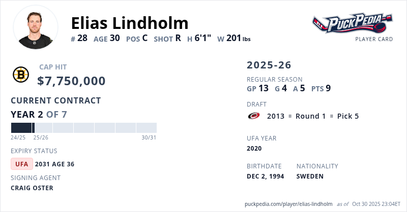 Elias Lindholm is signed to a 7 year, $54,250,000 contract with a cap hit of $7,750,000 per season, playing for the Boston Bruins. His contract expires at the end of the 2030-31 season, making Lindholm an Unrestricted Free Agent.