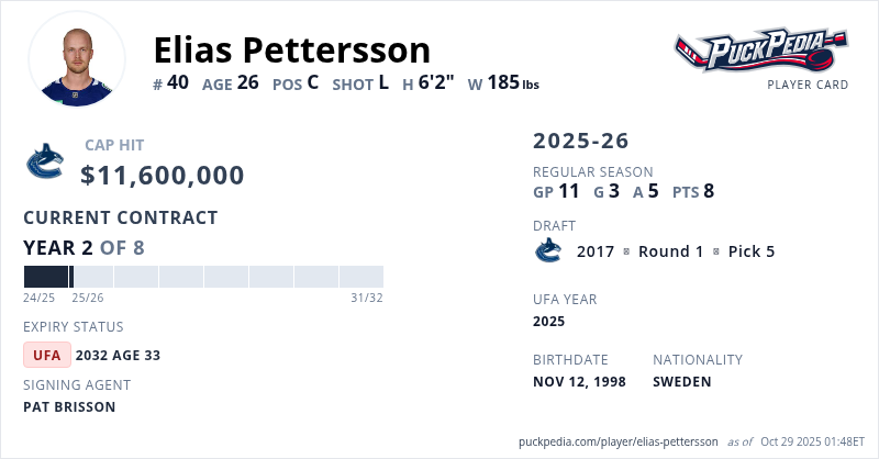 Elias Pettersson is signed to a 8 year, $92,800,000 contract with a cap hit of $11,600,000 per season, playing for the Vancouver Canucks. His contract expires at the end of the 2031-32 season, making Pettersson an Unrestricted Free Agent.