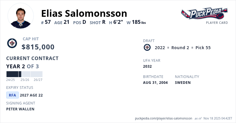 Elias Salomonsson is signed to a 3 year, $2,445,000 contract with a cap hit of $815,000 per season, playing for the Winnipeg Jets. His contract expires at the end of the 2026-27 season, making Salomonsson a Restricted Free Agent.