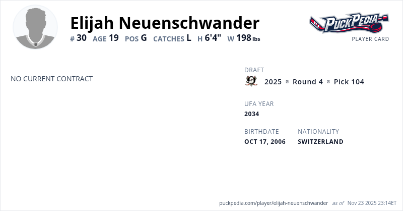 | 2025-26 | 19 | SL | EHC Chur | 6 | 3.11 | 0.883 | 0 | |||||||||||||||||||||||