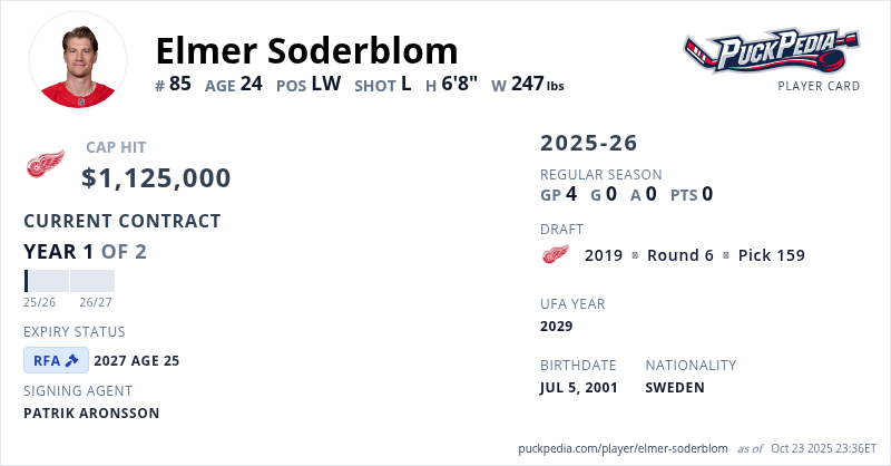 Elmer Soderblom is signed to a 2 year, $2,250,000 contract with a cap hit of $1,125,000 per season, playing for the Detroit Red Wings. His contract expires at the end of the 2026-27 season, making Soderblom a Restricted Free Agent.