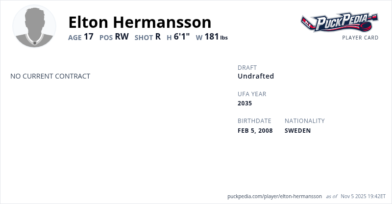 | 2024-25 | 16 | International-Jr | Sweden U18 (all) | 4 | 0 | 0 | 0 | 2 | ||||||||||||||||||||||