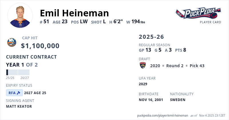 Emil Heineman is signed to a 2 year, $2,200,000 contract with a cap hit of $1,100,000 per season, playing for the New York Islanders. His contract expires at the end of the 2026-27 season, making Heineman a Restricted Free Agent.