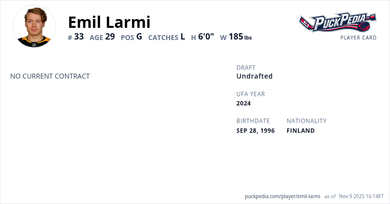 Emil Larmi is an Unrestricted Free Agent (No Qualifying Offer). His last contract was 2 years, $1,585,000 with a cap hit of $792,500 per season. It expired at the end of the 2020-21 season.