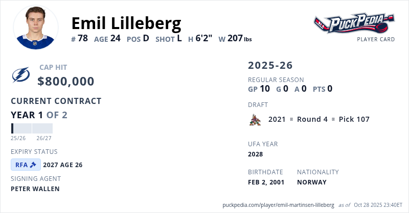 Emil Lilleberg is signed to a 2 year, $1,600,000 contract with a cap hit of $800,000 per season, playing for the Tampa Bay Lightning. His contract expires at the end of the 2026-27 season, making Lilleberg a Restricted Free Agent.