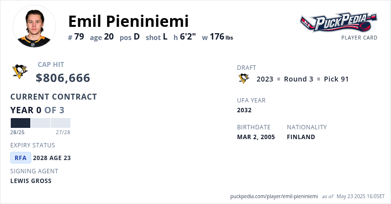 Emil Pieniniemi is signed to a 3 year, $2,419,998 contract with a cap hit of $806,666 per season, playing for the Pittsburgh Penguins. His contract expires at the end of the 2027-28 season, making Pieniniemi a Restricted Free Agent.