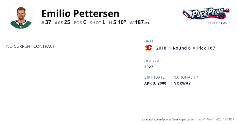Emilio Pettersen is an Unrestricted Free Agent (Group 6). His last contract was 1 year, $775,000 with a cap hit of $775,000 per season. It expired at the end of the 2024-25 season.