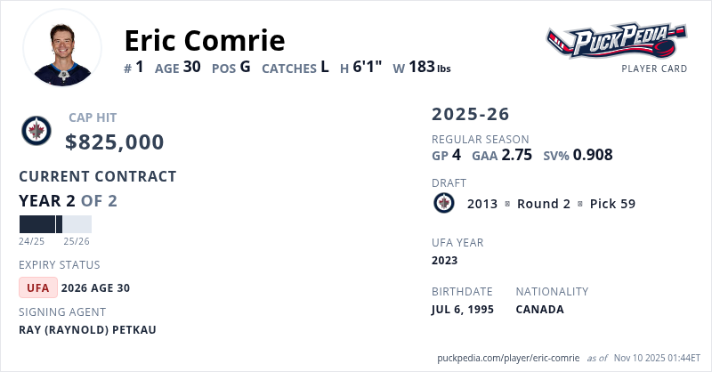 Eric Comrie is signed to a 2 year, $1,650,000 contract with a cap hit of $825,000 per season, playing for the Winnipeg Jets. His contract expires at the end of the 2025-26 season, making Comrie an Unrestricted Free Agent.