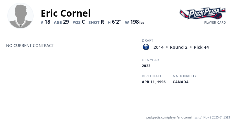 Eric Cornel is an Unrestricted Free Agent (No Qualifying Offer). His last contract was 3 years, $2,152,500 with a cap hit of $717,500 per season. It expired at the end of the 2018-19 season.