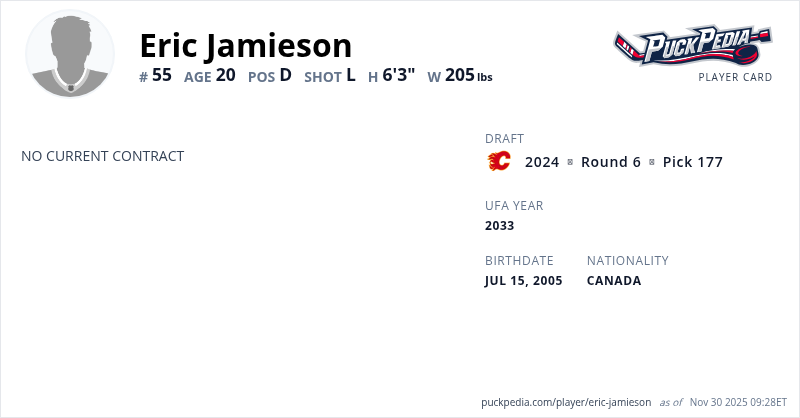| 2023-24 | 18 | WHL | Everett Silvertips | 66 | 10 | 22 | 32 | 70 | Playoffs | 9 | 0 | 1 | 1 | 0 | ||||||||||||||||