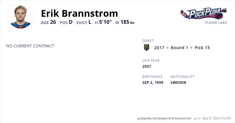 Erik Brannstrom is an Unrestricted Free Agent (No Qualifying Offer). His last contract was 1 year, $900,000 with a cap hit of $900,000 per season. It expired at the end of the 2024-25 season.
