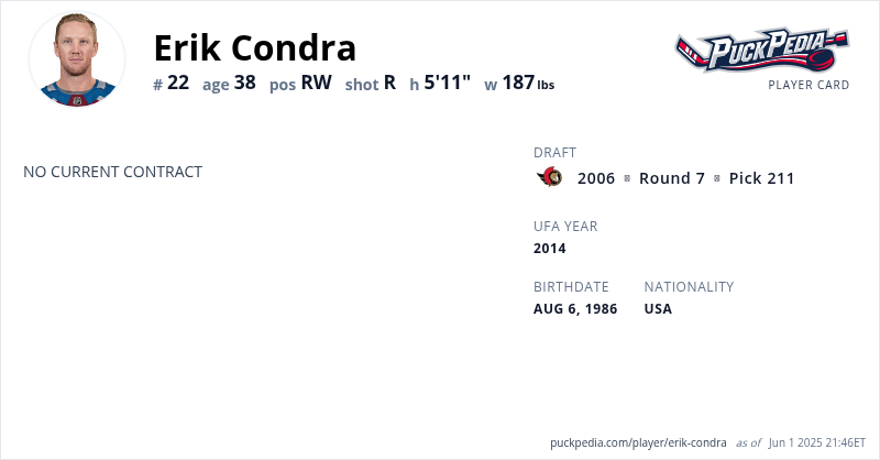 Erik Condra is an Unrestricted Free Agent. His last contract was 1 year, $700,000 with a cap hit of $700,000 per season. It expired at the end of the 2018-19 season.