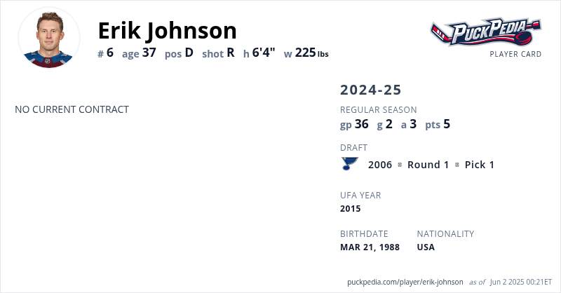 Erik Johnson is an Unrestricted Free Agent. His last contract was 1 year, $1,000,000 with a cap hit of $1,000,000 per season. It expired at the end of the 2024-25 season.