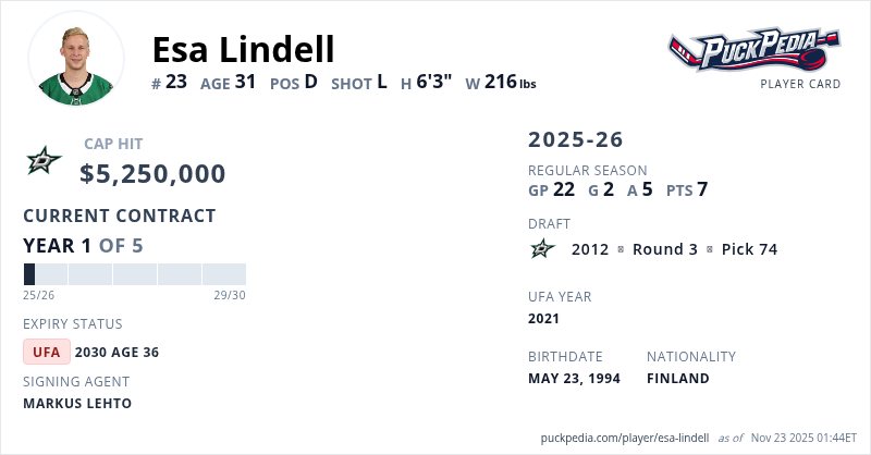 Esa Lindell is signed to a 5 year, $26,250,000 contract with a cap hit of $5,250,000 per season, playing for the Dallas Stars. His contract expires at the end of the 2029-30 season, making Lindell an Unrestricted Free Agent.