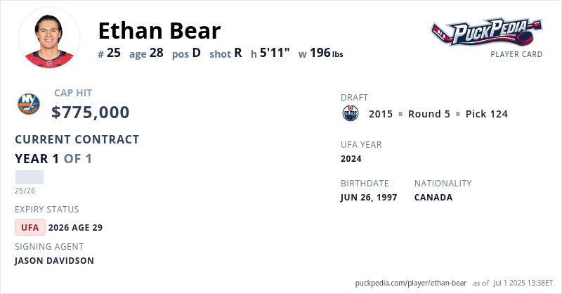 Ethan Bear is signed to a 1 year, $775,000 contract with a cap hit of $775,000 per season, playing for the New York Islanders. His contract expires at the end of the 2025-26 season, making Bear an Unrestricted Free Agent.