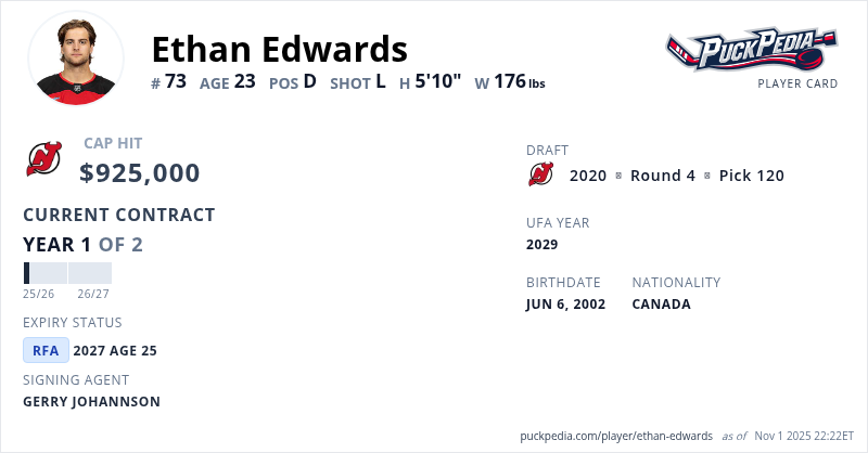 Ethan Edwards is signed to a 2 year, $1,850,000 contract with a cap hit of $925,000 per season, playing for the New Jersey Devils. His contract expires at the end of the 2026-27 season, making Edwards a Restricted Free Agent.