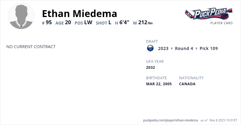 Miedema was selected 109th overall by the Buffalo Sabres in the 2023 NHL Entry Draft on Thursday.