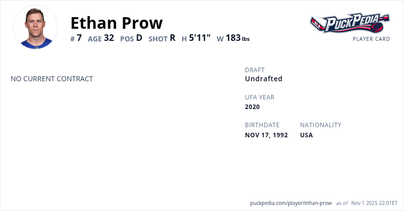 Ethan Prow is an Unrestricted Free Agent. His last contract was 1 year, $750,000 with a cap hit of $750,000 per season. It expired at the end of the 2021-22 season.