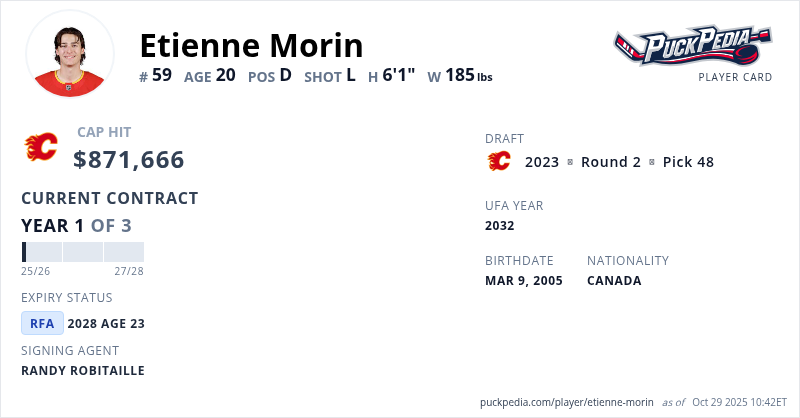 Etienne Morin is signed to a 3 year, $2,614,998 contract with a cap hit of $871,666 per season, playing for the Calgary Flames. His contract expires at the end of the 2027-28 season, making Morin a Restricted Free Agent.