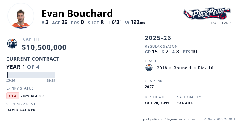 Evan Bouchard is signed to a 4 year, $42,000,000 contract with a cap hit of $10,500,000 per season, playing for the Edmonton Oilers. His contract expires at the end of the 2028-29 season, making Bouchard an Unrestricted Free Agent.