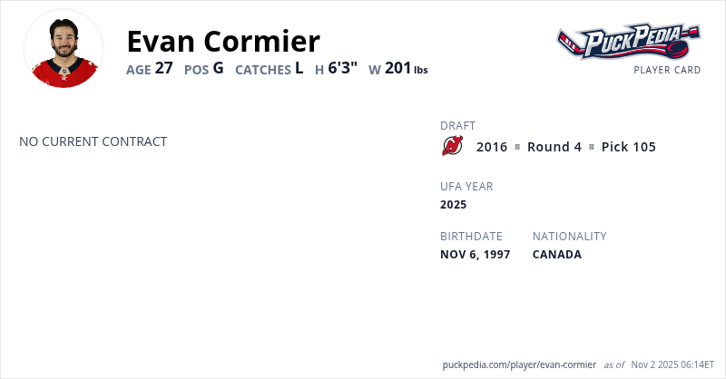 Evan Cormier is an Unrestricted Free Agent. His last contract was 1 year, $775,000 with a cap hit of $775,000 per season. It expired at the end of the 2024-25 season.