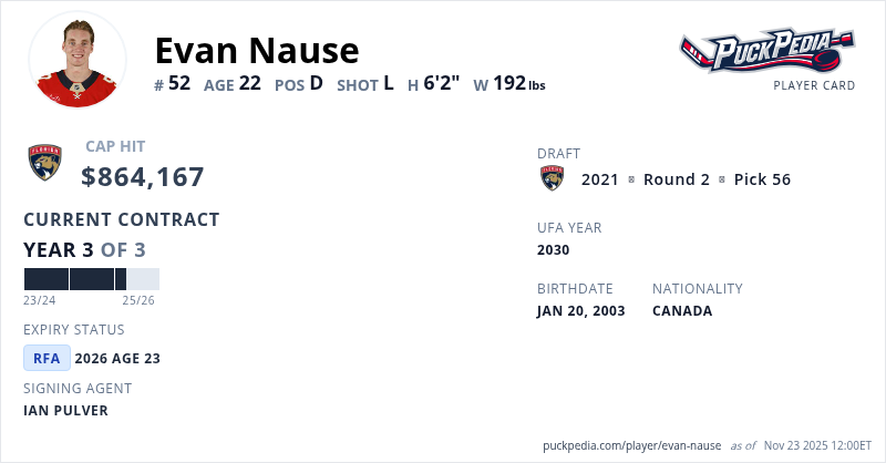 Evan Nause is signed to a 3 year, $2,592,501 contract with a cap hit of $864,167 per season, playing for the Florida Panthers. His contract expires at the end of the 2025-26 season, making Nause a Restricted Free Agent.