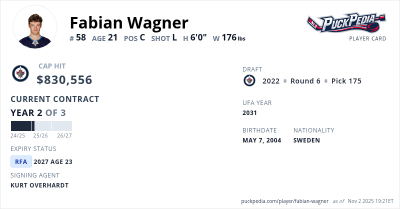 Fabian Wagner is signed to a 3 year, $2,491,668 contract with a cap hit of $830,556 per season, playing for the Winnipeg Jets. His contract expires at the end of the 2026-27 season, making Wagner a Restricted Free Agent.