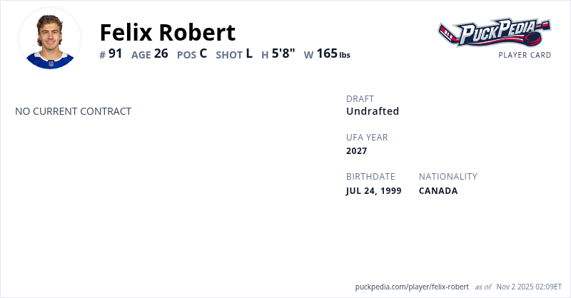 Felix Robert is an Unrestricted Free Agent (No Qualifying Offer). His last contract was 2 years, $1,715,000 with a cap hit of $857,500 per season. It expired at the end of the 2023-24 season.