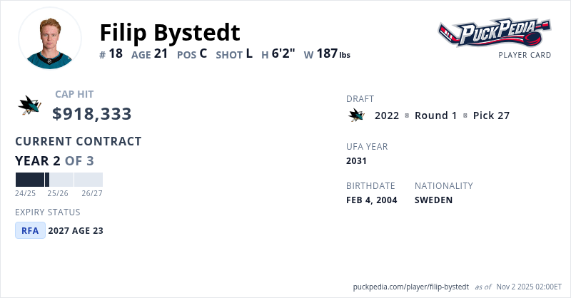 Filip Bystedt is signed to a 3 year, $2,754,999 contract with a cap hit of $918,333 per season, playing for the San Jose Sharks. His contract expires at the end of the 2026-27 season, making Bystedt a Restricted Free Agent.