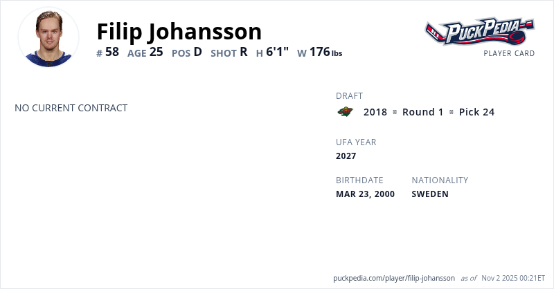 Filip Johansson is an Unrestricted Free Agent (No Qualifying Offer). His last contract was 2 years, $1,767,500 with a cap hit of $883,750 per season. It expired at the end of the 2023-24 season.