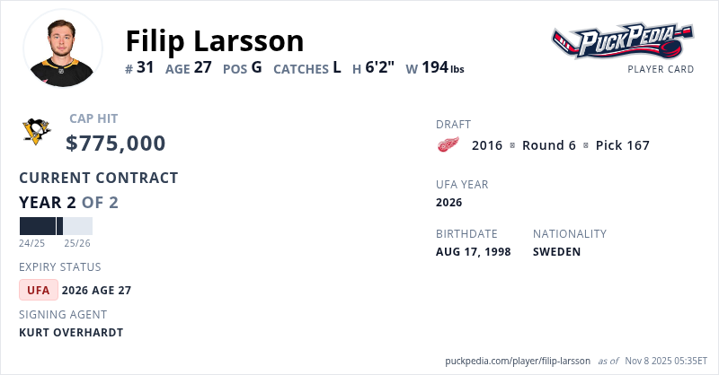 Filip Larsson is signed to a 2 year, $1,550,000 contract with a cap hit of $775,000 per season, playing for the Pittsburgh Penguins. His contract expires at the end of the 2025-26 season, making Larsson an Unrestricted Free Agent.