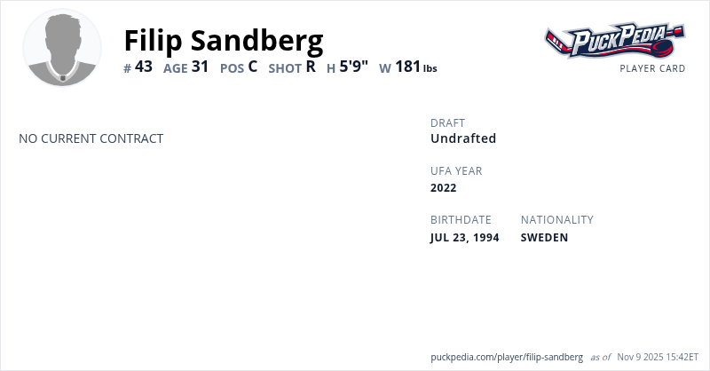 Filip Sandberg is an Unrestricted Free Agent. His last contract was 2 years, $1,535,000 with a cap hit of $767,500 per season. It expired at the end of the 2018-19 season.