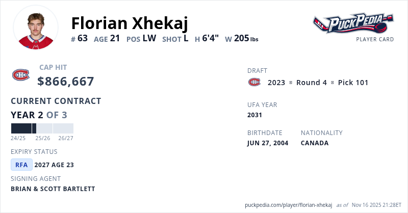 Florian Xhekaj is signed to a 3 year, $2,600,001 contract with a cap hit of $866,667 per season, playing for the Montreal Canadiens. His contract expires at the end of the 2026-27 season, making Xhekaj a Restricted Free Agent.
