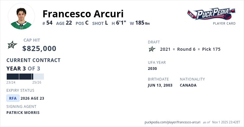 Francesco Arcuri is signed to a 3 year, $2,475,000 contract with a cap hit of $825,000 per season, playing for the Dallas Stars. His contract expires at the end of the 2025-26 season, making Arcuri a Restricted Free Agent.