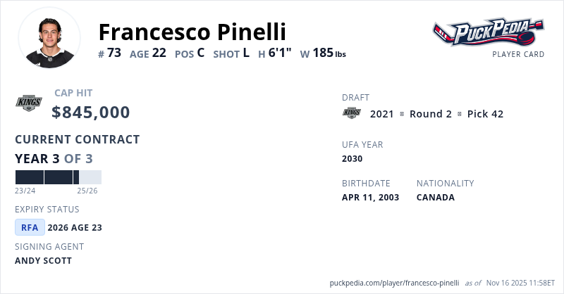 Francesco Pinelli is signed to a 3 year, $2,535,000 contract with a cap hit of $845,000 per season, playing for the Los Angeles Kings. His contract expires at the end of the 2025-26 season, making Pinelli a Restricted Free Agent.