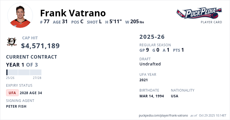 Frank Vatrano is signed to a 3 year, $13,713,567 contract with a cap hit of $4,571,189 per season, playing for the Anaheim Ducks. His contract expires at the end of the 2027-28 season, making Vatrano an Unrestricted Free Agent.