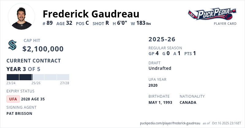Frederick Gaudreau is signed to a 5 year, $10,500,000 contract with a cap hit of $2,100,000 per season, playing for the Seattle Kraken. His contract expires at the end of the 2027-28 season, making Gaudreau an Unrestricted Free Agent.