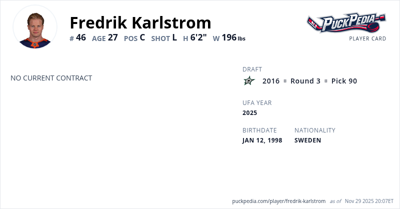Fredrik Karlstrom is an Unrestricted Free Agent. His last contract was 1 year, $775,000 with a cap hit of $775,000 per season. It expired at the end of the 2024-25 season.