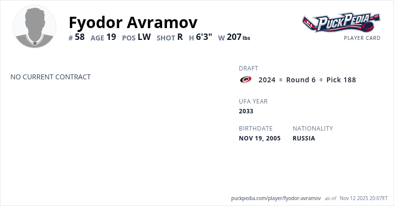 | 2025-26 | 20 | KHL | HK Sochi | 6 | 1 | 0 | 1 | 4 | ||||||||||||||||||||||