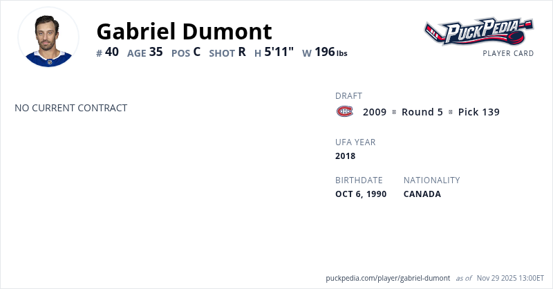 Gabriel Dumont is an Unrestricted Free Agent. His last contract was 1 year, $750,000 with a cap hit of $750,000 per season. It expired at the end of the 2021-22 season.