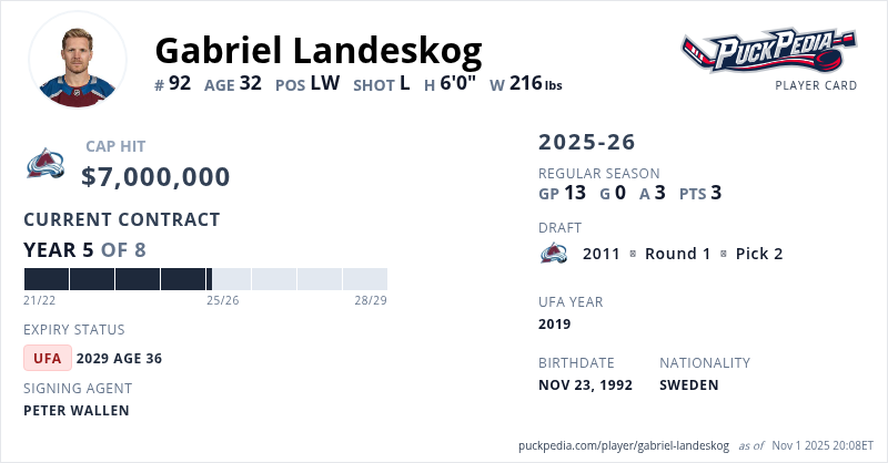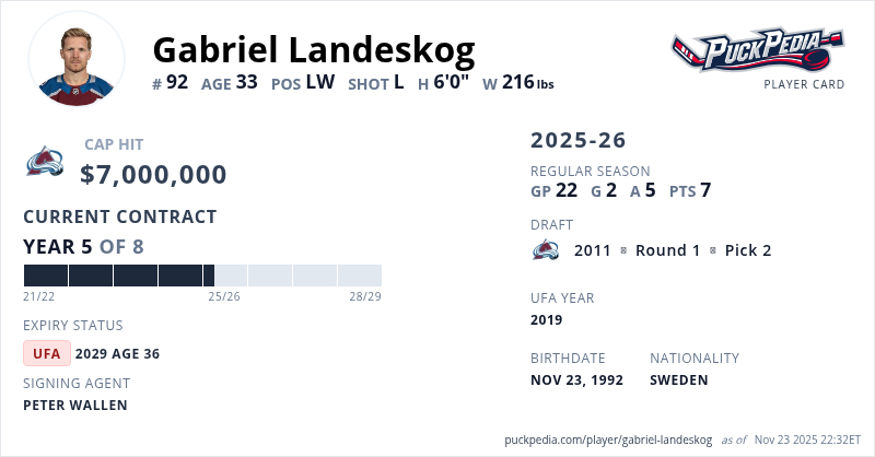 Gabriel Landeskog is signed to a 8 year, $56,000,000 contract with a cap hit of $7,000,000 per season, playing for the Colorado Avalanche. His contract expires at the end of the 2028-29 season, making Landeskog an Unrestricted Free Agent.