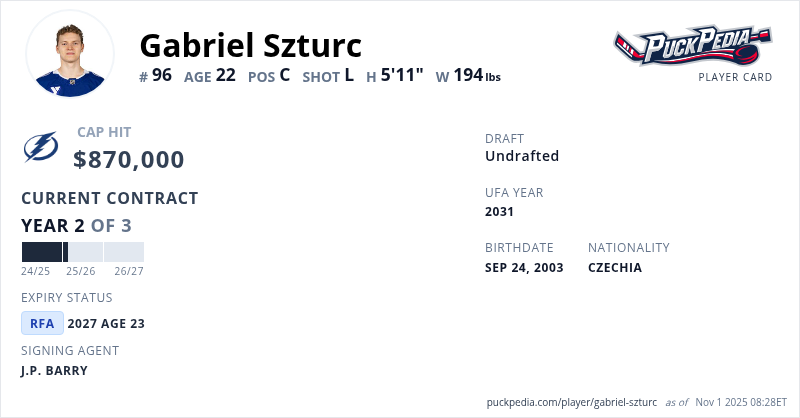Gabriel Szturc is signed to a 3 year, $2,610,000 contract with a cap hit of $870,000 per season, playing for the Tampa Bay Lightning. His contract expires at the end of the 2026-27 season, making Szturc a Restricted Free Agent.