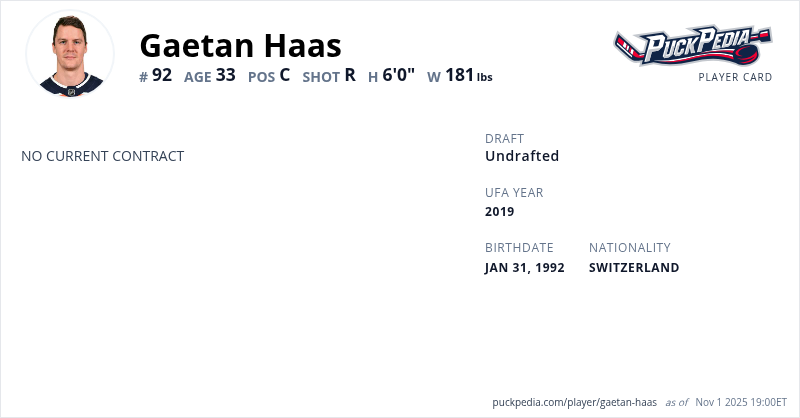 Gaetan Haas is an Unrestricted Free Agent. His last contract was 1 year, $915,000 with a cap hit of $915,000 per season. It expired at the end of the 2020-21 season.