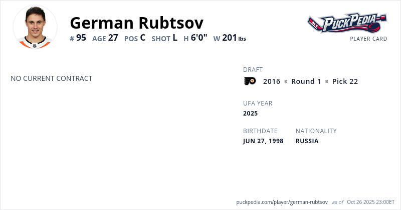 German Rubtsov is an Unrestricted Free Agent (No Qualifying Offer). His last contract was 1 year, $750,000 with a cap hit of $750,000 per season. It expired at the end of the 2021-22 season.