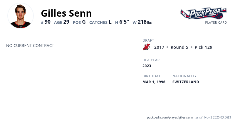 Gilles Senn is a Restricted Free Agent. His last contract was 2 years, $1,635,000 with a cap hit of $817,500 per season. It expired at the end of the 2020-21 season.