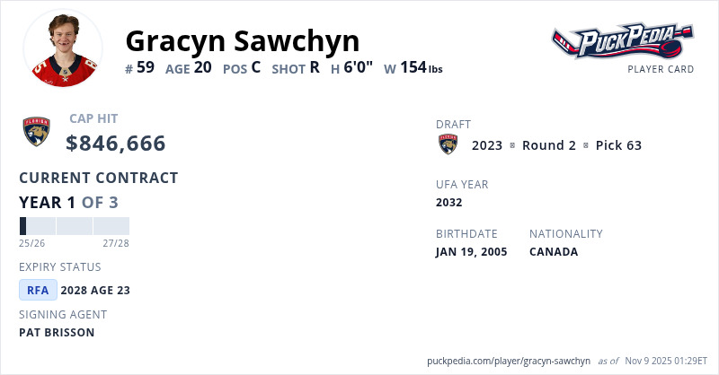 Gracyn Sawchyn is signed to a 3 year, $2,539,998 contract with a cap hit of $846,666 per season, playing for the Florida Panthers. His contract expires at the end of the 2027-28 season, making Sawchyn a Restricted Free Agent.
