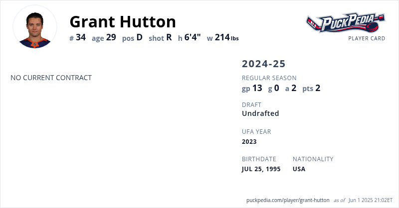 Grant Hutton is an Unrestricted Free Agent. His last contract was 3 years, $2,325,000 with a cap hit of $775,000 per season. It expired at the end of the 2024-25 season.