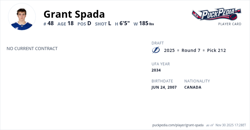 | 2024-25 | 17 | OHL | Guelph Storm | 58 | 0 | 6 | 6 | 85 | ||||||||||||||||||||||
