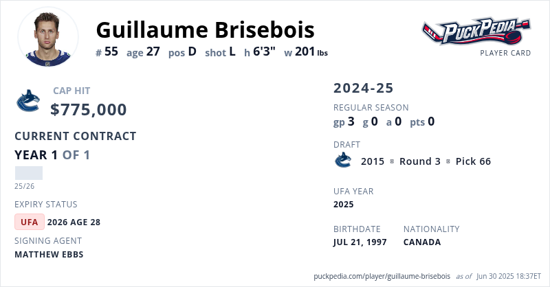 Guillaume Brisebois is signed to a 1 year, $775,000 contract with a cap hit of $775,000 per season, playing for the Vancouver Canucks. His contract expires at the end of the 2025-26 season, making Brisebois an Unrestricted Free Agent.